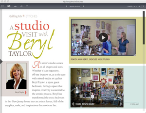 Significantly, this product is not a digital replica of the Quilting Arts magazine. Instead, it combines a custom-designed interface with some magazine-like features, such as a “cover,” an editor’s letter, a table of contents in a sidebar, and numbered articles instead of page numbers. Inside the stories, however, embedded audio, video and slideshows bring the topics to life and give users a close-up view of the quilting skills described.