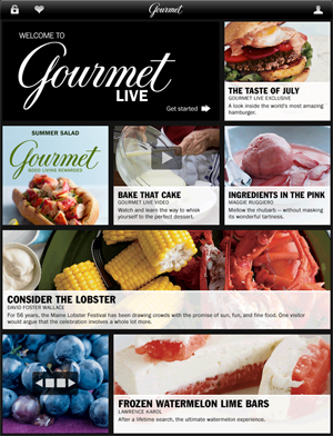 The application will include the same kinds of content that Gourmet did in print, including articles and recipes, but will also feature video and photo slideshows. Like the Interweave eMag, the application doesn’t resemble a magazine with “pages” that turn, but instead allows the user to touch and swipe photos and icons to operate the application. Some content will be drawn from Gourmet’s archives, complemented by new content developed for the application.