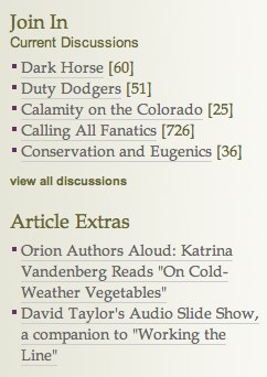 Similar engagement is happening at Orion, an award-winning magazine covering environmental issues. Though the magazine has been published since 1982, it redeveloped its website in 2006 and now also has a podcast, a presence on Facebook and Twitter, and a digital replica edition.
