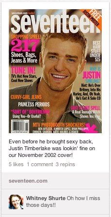 Quite a few magazines have created boards of “vintage” covers. One interesting example is Seventeen. Most of Seventeen’s boards have relatively few images pinned, seeming to reveal a minimal investment in its presence on the site. However, its “Vintage Seventeen Covers” board includes 79 covers dating back to the 1950s. Seventeen’s reader demographic, with an average age of 16, doesn’t really match Pinterest’s primary users yet, but the somewhat older women who are on the site might enjoy the nostalgia of the vintage covers.