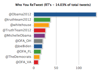 The Obama campaign had more than 150,000 retweets during this two-week period. Romney, on the other hand, had almost 8,600 retweets. However, on Twitter the ratio between the two campaigns matches: 17-to-1 total tweets, 17-to-1 retweets.