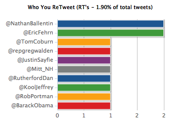 In its analysis of June tweets, the report shows that only 16% of @BarackObama tweets were retweets. Most of those were campaign related; only 3% of all tweets were “retweets of citizen posts.” During the two-week analysis, the Romney camp had one retweet.