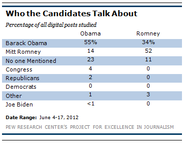 Not surprisingly, the challenger was more than twice as likely to mention the incumbent than the other way around. In June, Romney’s campaign devoted about a third of its posts to Obama, “largely attacking him for a policy stance or action.” The Obama campaign mentioned Romney half as much.