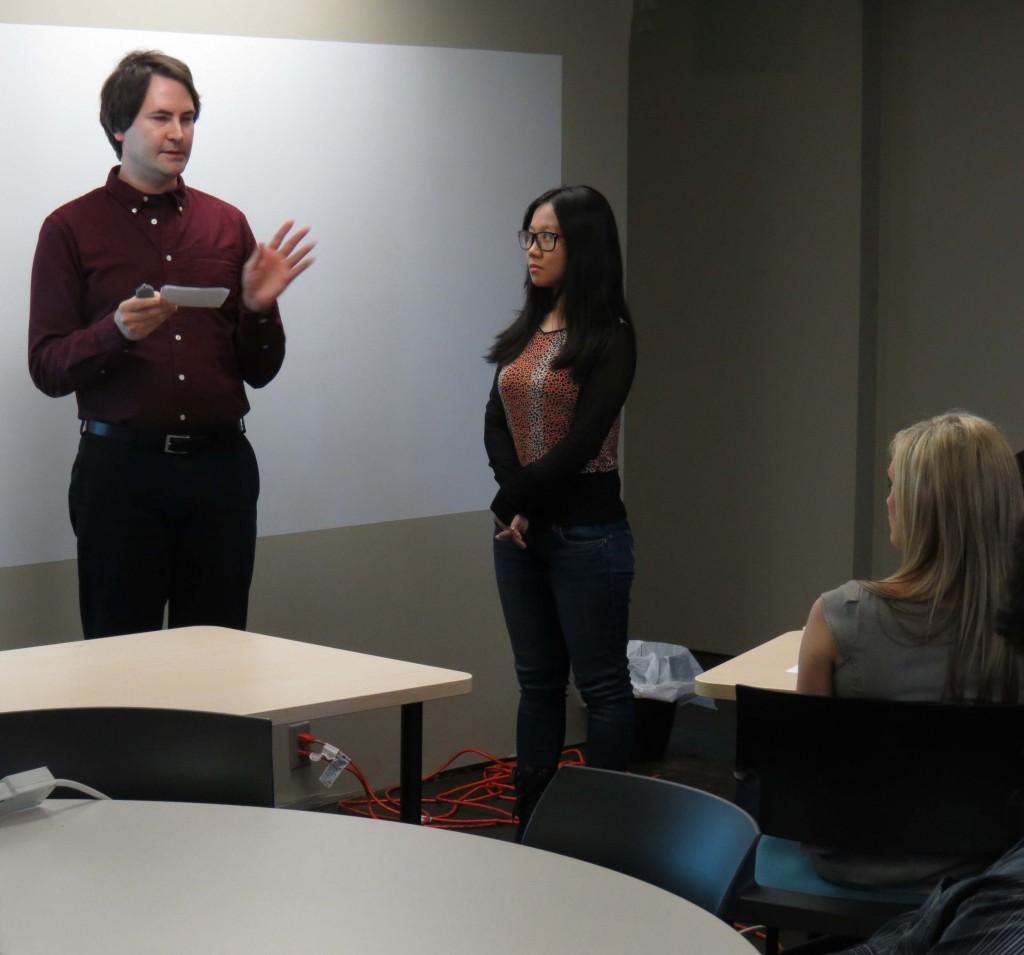 Student Tyler Stafford and Tiffany Zhou give their pitch for app Turn It Off. Photo by Michael Lander.