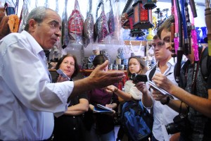 A Palestinian merchant in Hebron, left, explains the impact of the Israeli-Palestinian conflict on the local economy.