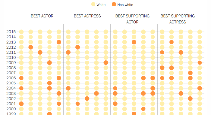 Race played a leading role in the run up to this past weekend’s Academy Awards ceremony. The heated controversy for its tone-deaf nominations–20 out of 20 in the acting categories went to white actors and actresses–has led to calls to boycott the ceremony, followed by pushback and agreement from a variety of celebrities and commitments from the Academy to increase diversity among its membership. The story has also spurred data journalists and information designers to dig into historical data and present the alarming lack of representation from actors of color.